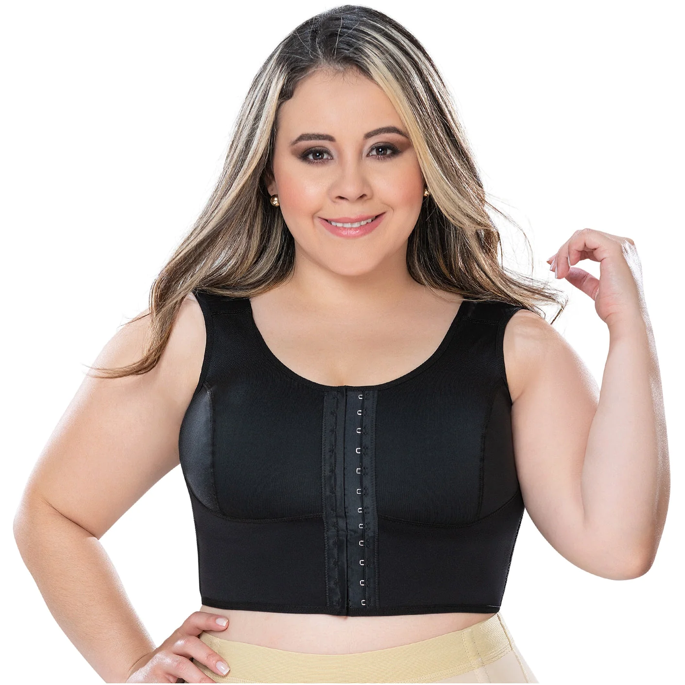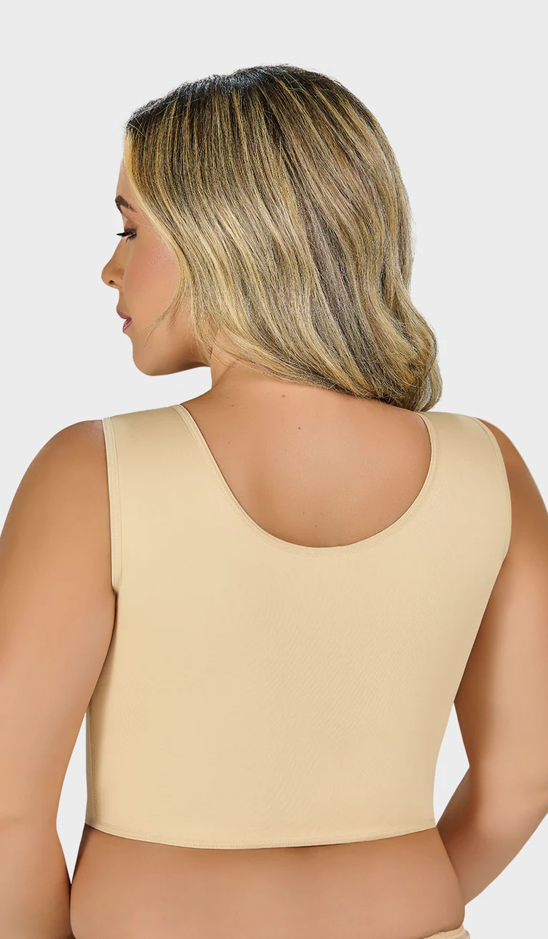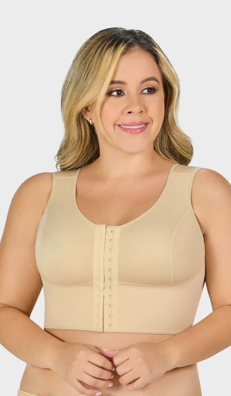 Control bra top type, bust enhancement, covered back and wide straps, side steel bones, TWO level covered hooks. Only for daily use.