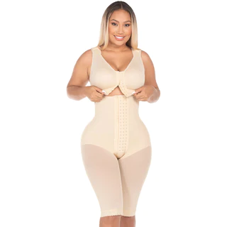 Made of Power net Compression level: High Guitar shaped faja with Ultra capacity Bra included. Shapes and slims. Silicone leg bands to avoid uncomfortable roll-ups. High back and underarm coverage. Hook and eye front closure with 4 levels of adjustment Wide adjustable straps. Knee-Length design. Zippered crotch. Controls back, bust, abdomen, hips, legs, and bottom. Daily and Post Surgical use. Natural butt lifting effect. Beautiful and confident, all day long. Shapes and slims. Improves posture. Silicone leg bands to avoid uncomfortable roll-ups.