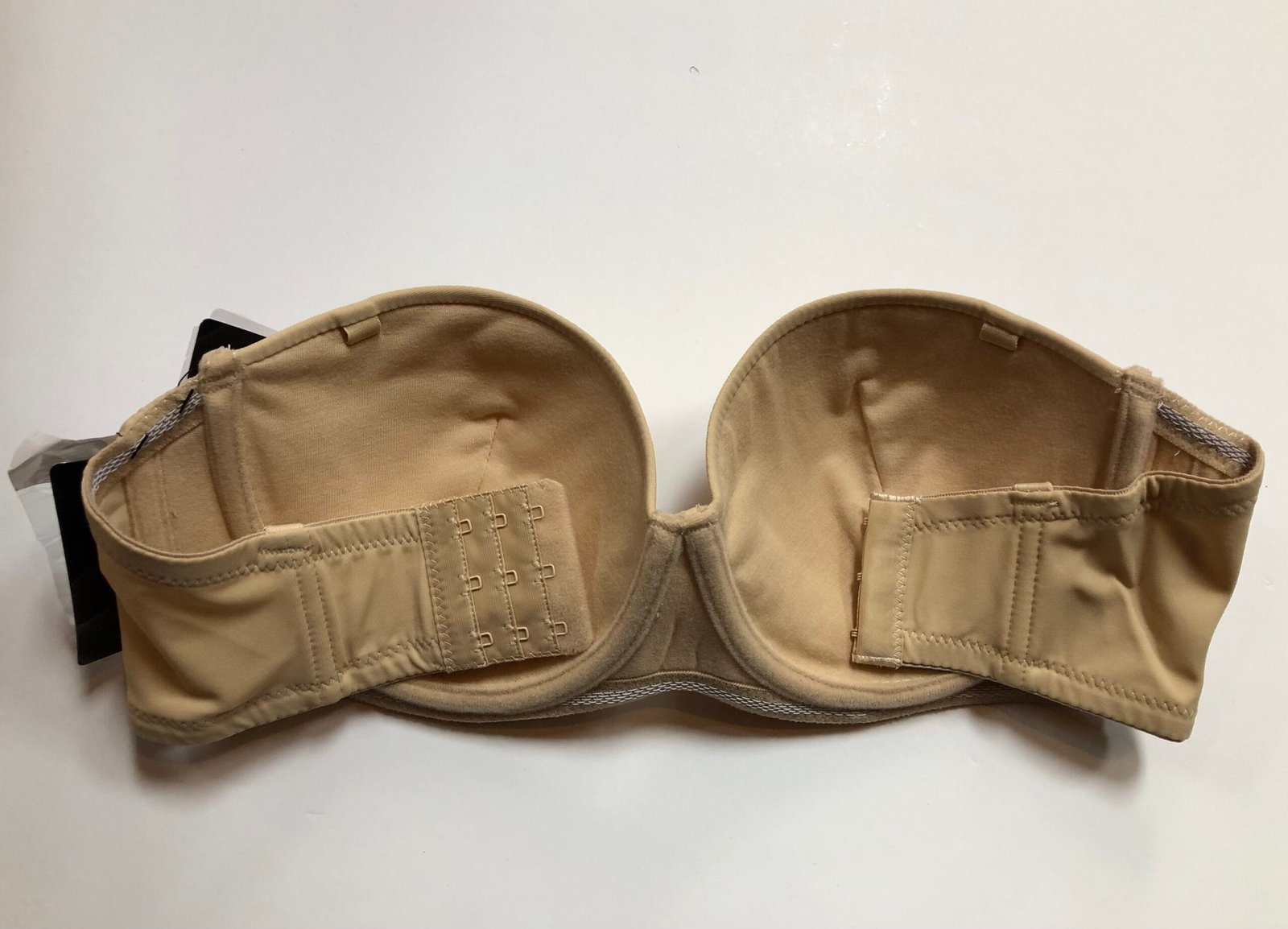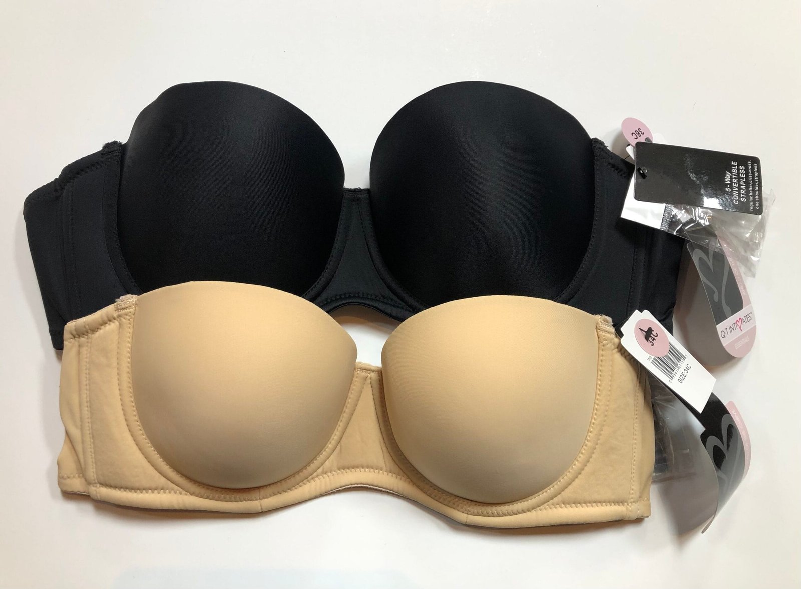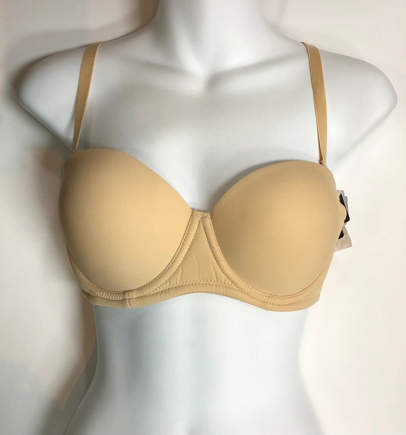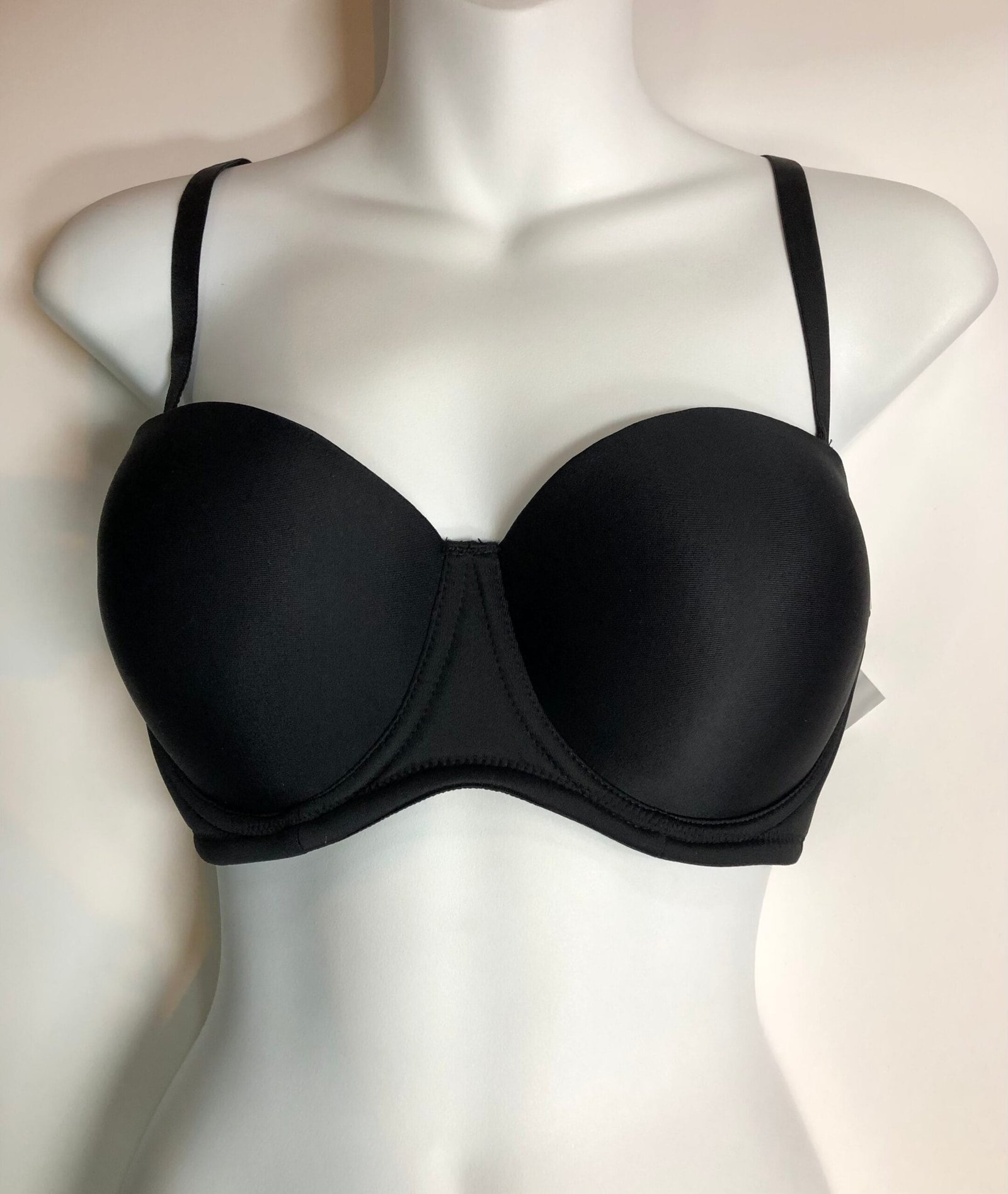 This bra offers wearing options such as strapless, halter style, criss-cross, one shoulder, or classic look. Underwire cups are lightly padded for a smooth, rounded shape. Grip elastic on the sides and back keeps the bra in place. Smooth sides with boning. Foam padding along frame for added comfort. Comes with clear and self-color straps. Many hook and eye adjustments for comfort wear at any time. Small bump at bottom of cup for slight lift
